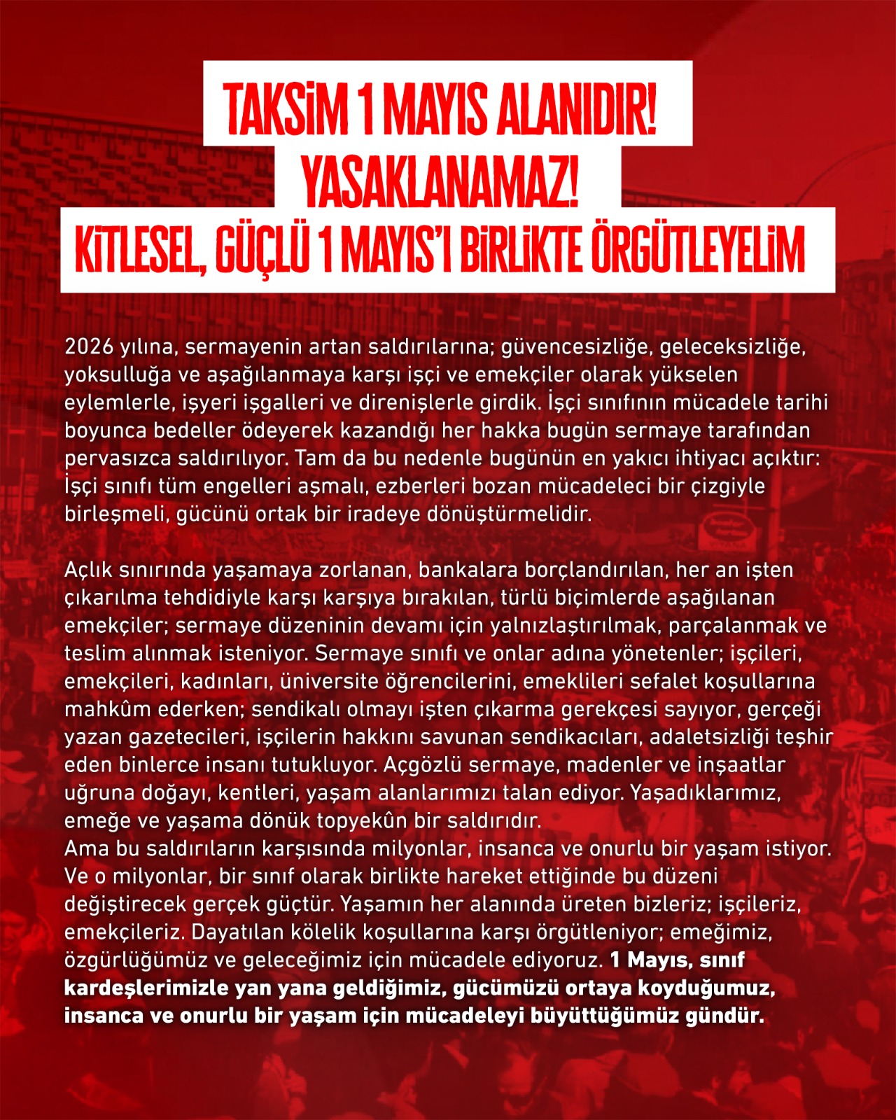 Sermayeye karşı mücadelesiyle yoksulluğu, sömürüyü ve onursuzluğu reddeden; geleceksizliğe, baskıya, emperyalist savaşa ve sefalet düzenine karşı ayağa kalkan işçi sınıfına Taksim yasaklanamaz.